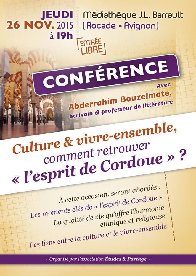 Jeudi 26 novembre 2015 à 19h à la médiathèque Jean-Louis Barrault, l’Association Études et Partage (AEP) organise une conférence avec Abderrahim Bouzelmate, écrivain et professeur de littérature, sur le thème Culture et Vivre-ensemble, comment retrouver « l’esprit de Cordoue » ?